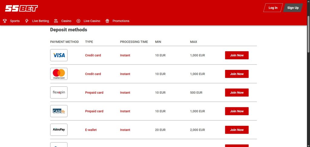 55Bet Casino guarantees fast and secure money transfers using reliable systems. The minimum deposit is €10, while the minimum withdrawal starts from €20. Players can withdraw up to €10,000 per day, €25,000 per week, and €100,000 per month, with payments processed within 1-3 bank days.