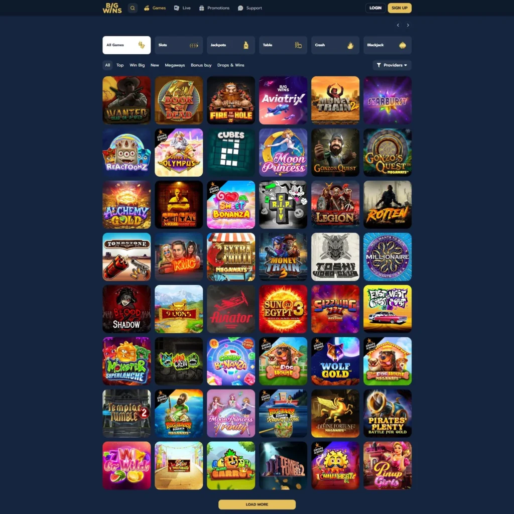 Big Wins makes sure you have a great time as a customer. The main colors on their site are blue, black, gold, and white. They mix well. You can tell the choices apart easy because the letters and symbols are big and clear. They don’t crowd the homepage with too many symbols. It’s easy to move around and find different games right from the start page. But, you only see a few game options at once; you can scroll to see more.