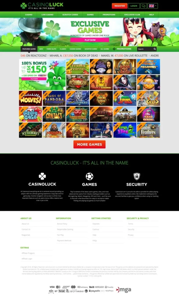 CasinoLuck, well-known but still growing among gamers, comes from Minotauro Media Ltd in Ireland. Its Irish roots show in the logo with a four-leaf clover. Aspire Global International Ltd in Malta runs the site’s gaming and software.