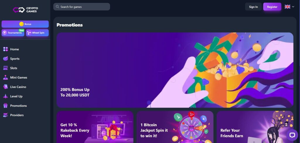 Crypto-Games Casino uses a minimal but effective layout that keeps things organised and easy to understand. At the top of the screen, you’ll find the Sign In and Register buttons. These are visible and simple to use, allowing quick access for both returning and new players.