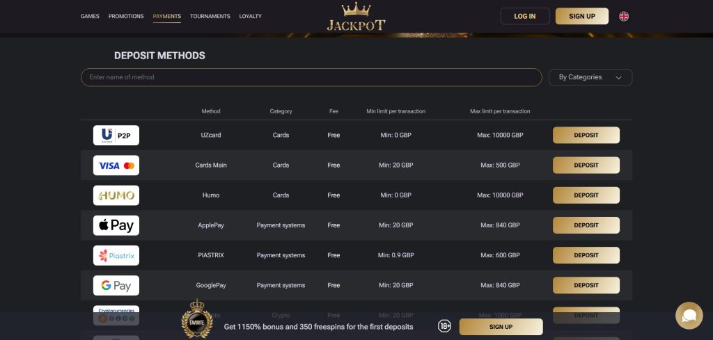 The casino supports UZS, EUR, GBP, CAD, USD, and UAH, making it convenient for UK and international players.