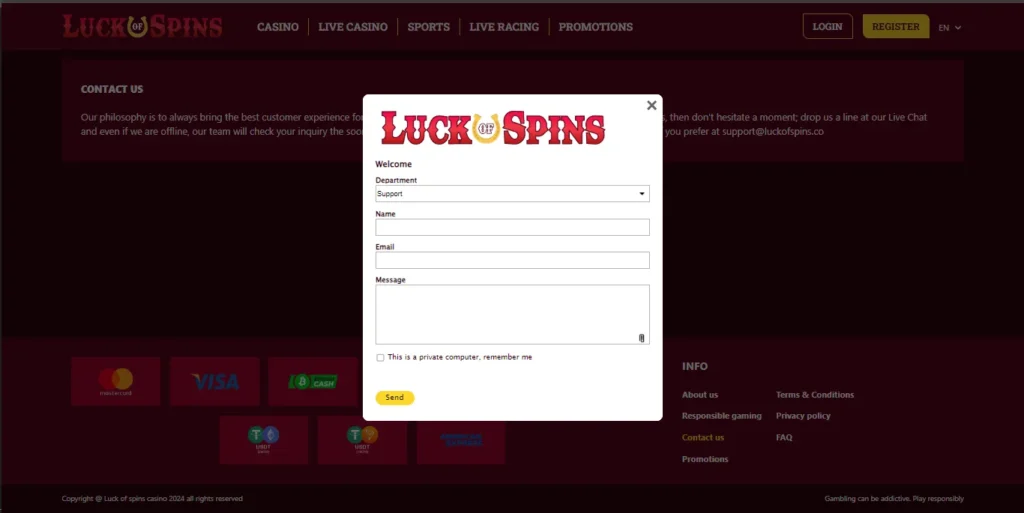 Players can contact Luck of Spins support team by email, live chat or telephone.